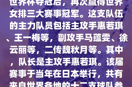 在2011年日本女排世界杯赛中,中国女排以全胜战绩摘得冠军,这也是中国女排继1995年世界杯夺冠后,再次赢得世界女排三大赛事冠军。这支队伍的主力队员包括主攻手惠若琪、王一梅等,副攻手马蕴雯、徐云丽等,二传魏秋月等。其中,队长是主攻手惠若琪。该届赛事于当年在日本举行,共有来自世界各地的十二支球队参与角逐。此外,该届世界杯的最佳发球奖由日本名将木村纱织获得。