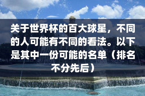 • 转载请注明来自眉山市正发家政服务有限公司,本文标题:《关于世界杯的百大球星,不同的人可能有不同的看法。以下是其中一份可能的名单(排名不分先后)》