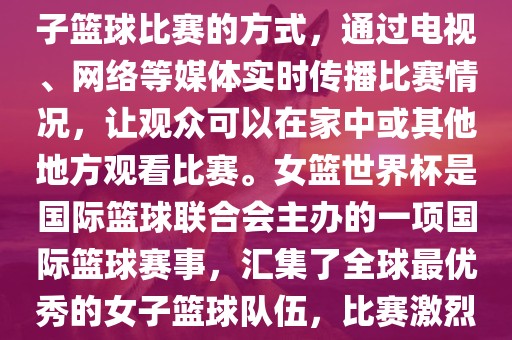 直播女篮世界杯是一种观看女子篮球比赛的方式,通过电视、网络等媒体实时传播比赛情况,让观众可以在家中或其他地方观看比赛。女篮世界杯是国际篮球联合会主办的一项国际篮球赛事,汇集了全球最优秀的女子篮球队伍,比赛激烈、精彩纷呈。