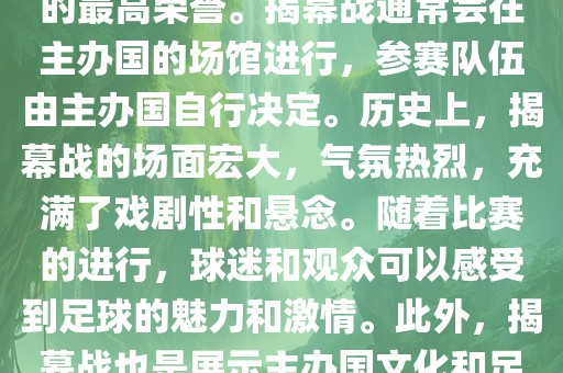 世界杯揭幕战是世界杯足球赛的开幕式比赛,具有重大象征意义,代表全球足球最高荣誉。比赛通常在主办国的场馆进行,场面宏大、气氛热烈。揭幕战是每届世界杯的重要组成部分,展示主办国的文化和足球风格,让球迷和观众感受到足球的魅力和激情。