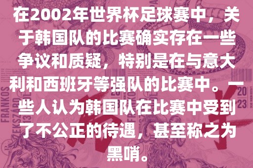 在2002年世界杯足球赛中,关于韩国队的比赛确实存在一些争议和质疑,特别是在与意大利和西班牙等强队的比赛中。一些人认为韩国队在比赛中受到了不公正的待遇,甚至称之为黑哨。