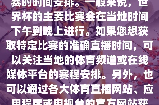 由于时差和版权问题,不是所有比赛都能在所有地区进行直播,建议您关注官方渠道或可靠的新闻来源以获取最新的世界杯直播时间信息。