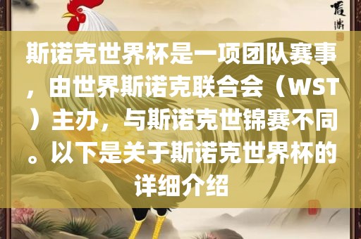 斯诺克世界杯是一项团队赛事,由世界斯诺克联合会(WST)主办,与斯诺克世锦赛不同。以下是关于斯诺克世界杯的详细介绍