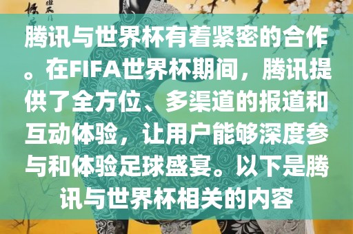 腾讯与世界杯有着紧密的合作。在FIFA世界杯期间,腾讯提供了全方位、多渠道的报道和互动体验,让用户能够深度参与和体验足球盛宴。以下是腾讯与世界杯相关的内容