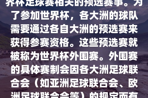 世界杯外围赛通常指的是与世界杯足球赛相关的预选赛事。为了参加世界杯,各大洲的球队需要通过各自大洲的预选赛来获得参赛资格。这些预选赛就被称为世界杯外围赛。外围赛的具体赛制会因各大洲足球联合会(如亚洲足球联合会、欧洲足球联合会等)的规定而有所不同。