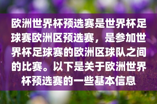 欧洲世界杯预选赛是参加世界杯足球赛的欧洲区球队之间的比赛,对于参加世界杯的欧洲足球队来说具有重要意义,通过预选赛,各队可以锻炼实力、积累经验,为参加世界杯做好准备。