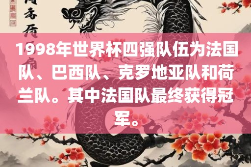 1998年世界杯四强队伍为法国队、巴西队、克罗地亚队和荷兰队。其中法国队最终获得冠军。