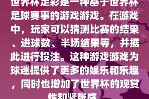 摘要:世界杯足彩是一种基于足球赛事的游戏,玩家可以通过猜测比赛结果、进球数和半场结果等进行投注。这种游戏为球迷提供了更多娱乐和乐趣,增加了世界杯的观赏性和紧张感。