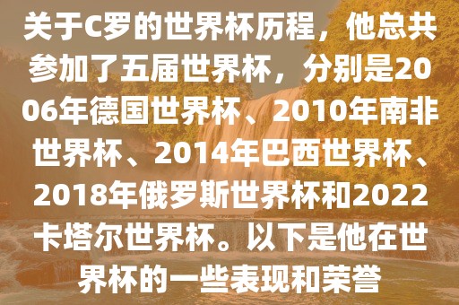 关于C罗的世界杯历程,他总共参加了五届世界杯,分别是2006年德国世界杯、2010年南非世界杯、2014年巴西世界杯、2018年俄罗斯世界杯和2022卡塔尔世界杯。以下是他在世界杯的一些表现和荣誉