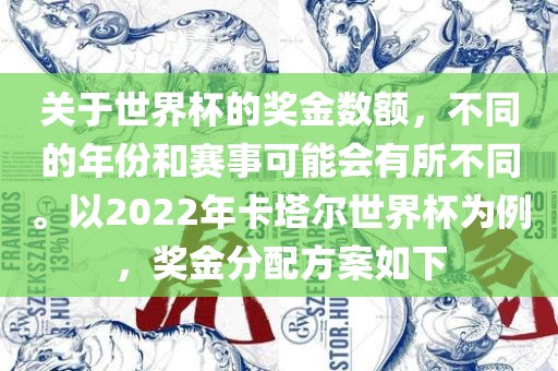 关于世界杯的奖金数额,不同的年份和赛事可能会有所不同。以2022年卡塔尔世界杯为例,奖金分配方案如下